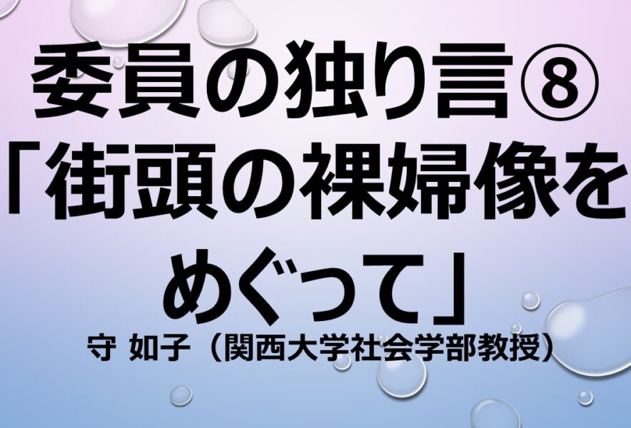 街の裸婦像の撤去が続いている問題について、実演者地位向上委員会の園田寿委員から「裸婦像撤去は文化の自滅行為」という指摘があった(2025年8月25日)。女性裸体像を猥褻(わいせつ)だときめつけ、不快感を理由に排除するのではなく、多様な表現が共存する社会を構築することこそが重要であるという指摘は最もだと考える。ただし、そもそも街の裸体像は(男性ではなく)女性であるのはなぜなのだろうかという疑問が残る。